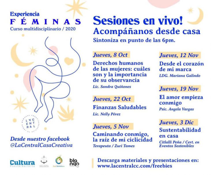 Las sesiones se imparten los días martes y jueves a las 18:00 horas. Si bien los cupos están agotados para las siguientes actividades, las mujeres interesadas pueden seguir la transmisión en vivo y descargar los materiales didácticos de talleres seleccionados a través de las redes sociales del IVC, Canal del Puerto, La Central Casa Creativa y en el sitio web www.lacentralcc.com