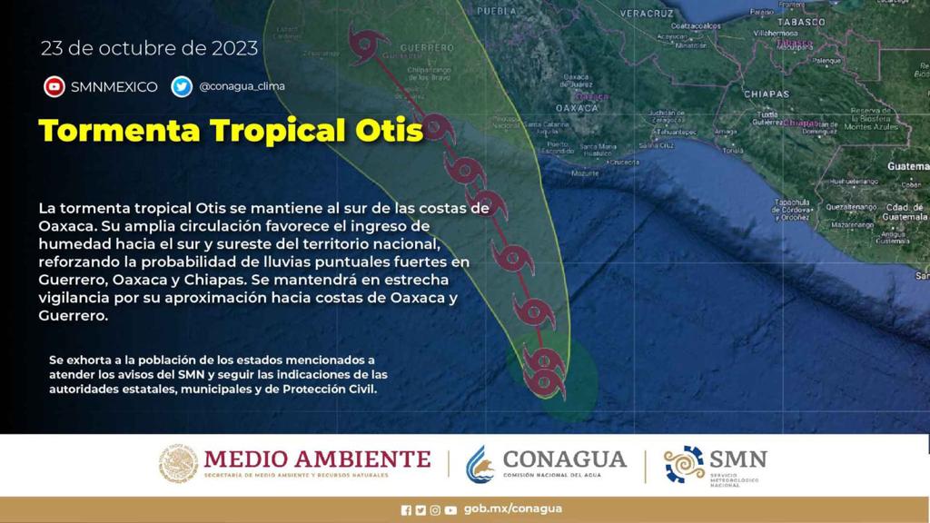 La coordinadora general del Servicio Meteorológico Nacional (SMN), Alejandra Méndez Girón, informó que Otis se localiza actualmente a 310 kilómetros al sur-suroeste de Puerto Ángel, Oaxaca, y a 490 kilómetros al sur-sureste de Acapulco, Guerrero, con vientos sostenidos de 85 km/h y movimiento hacia el nor-noroeste a 11 km/h. Se espera que durante la tarde de hoy, el sistema mantenga su desplazamiento hacia el nor-noroeste y que su centro se localice aproximadamente a 400 km de las costas de Guerrero.