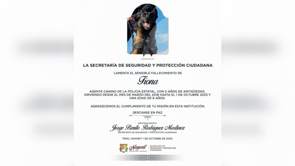La Policía Estatal de Nayarit agradece a «Fiona» por su devoción y sacrificio en la protección de las vidas y propiedades de los ciudadanos. Su legado perdurará en la memoria de todos aquellos a quienes ha servido y protegido con valentía.