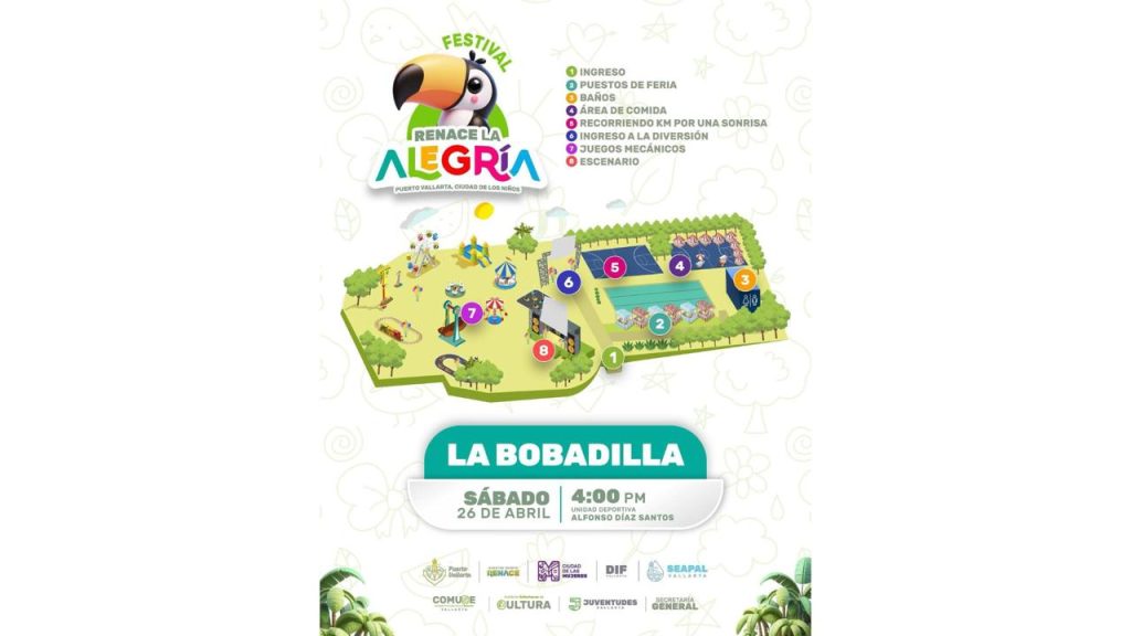 Con el propósito de celebrar a la niñez y fomentar la convivencia familiar, el gobierno del bien, encabezado por el alcalde Luis Munguía González, invita a todas las familias de Puerto Vallarta al arranque del Festival “Renace la Alegría”, este sábado 26 de abril a las 4:00 de la tarde en la Unidad Deportiva Alfonso Díaz Santos, en la colonia La Bobadilla.