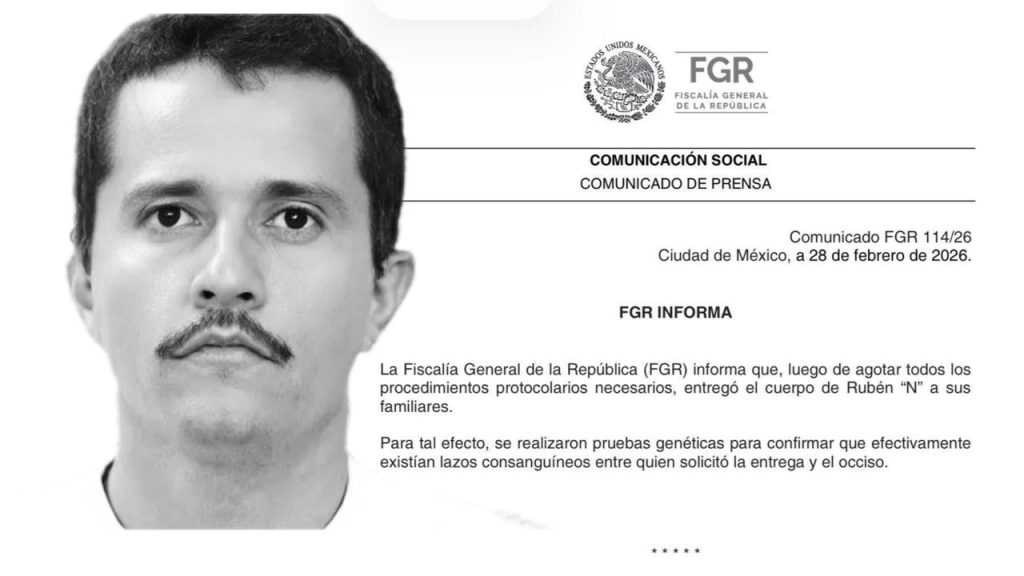 La Fiscalía General de la República (FGR) puso fin este sábado a la custodia de los restos de Nemesio Oseguera Cervantes, entregándolos a sus familiares tras agotar los protocolos de ley. La solicitud, presentada desde el miércoles por abogados de la familia, tuvo que superar una serie de exámenes genéticos para certificar plenamente la identidad de los beneficiarios antes de la liberación del cadáver.