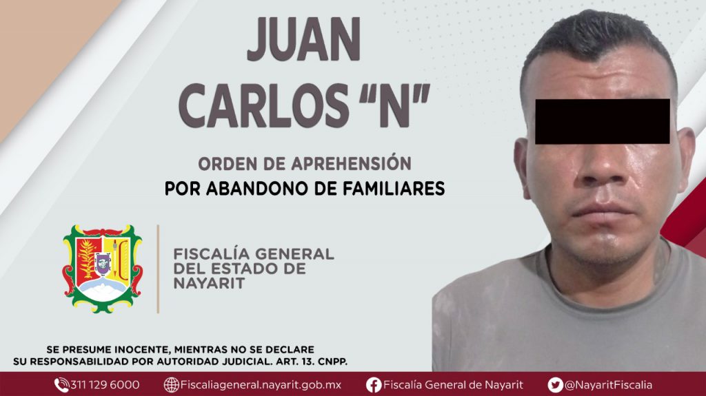 Comunicado.- En Puerto Vallarta, Jalisco y con la colaboración de la Fiscalía General de esa entidad, la Fiscalía General de Nayarit a través de la Agencia de Investigación Criminal ejecutó una orden de aprehensión contra Juan Carlos “N”, quien es originario del municipio de Jala y vecino de Puerto Vallarta, Jalisco, por su presunta participación en hechos que según apreciación de la ley encuadran el delito de abandono de familiares, cometido en agravio de una menor de identidad reservada.