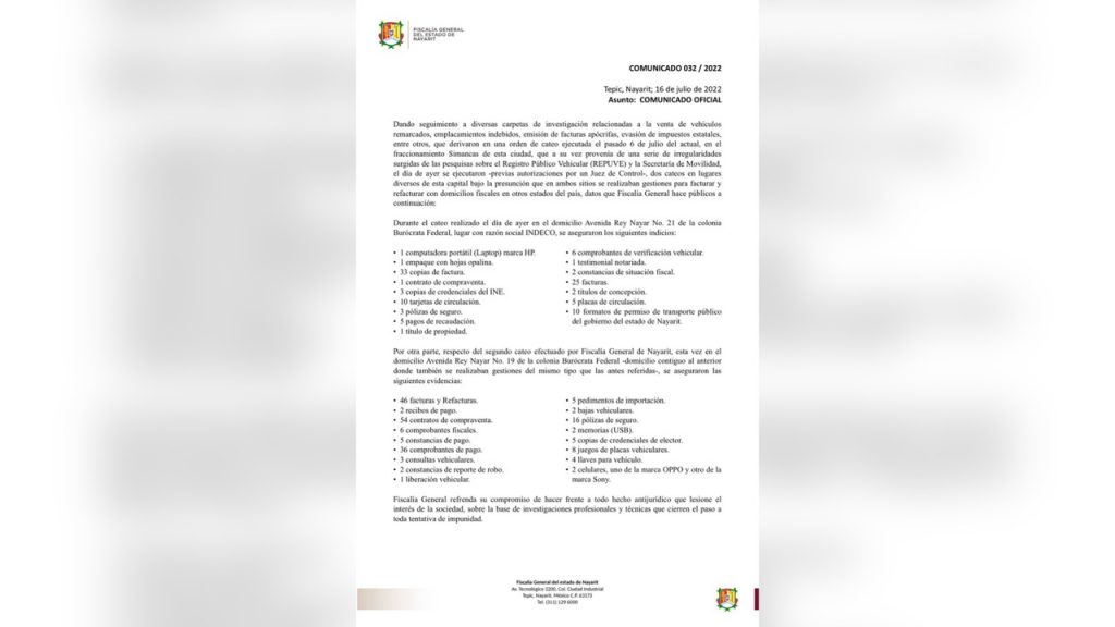 El día 15 de julio 2022, se ejecutaron -previas autorizaciones por un Juez de Control-, dos cateos en lugares diversos en Tepic, bajo la presunción que en ambos sitios se realizaban gestiones para facturar y refacturar autos con domicilios fiscales en otros estados del país.