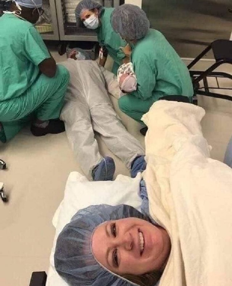 La madre, aún tapada con una sábana y con un gorro que le recoge el cabello, se ríe de la situación mientras fotografía a su marido rodeado por el personal médico, uno de los cuales sostiene en brazos al recién nacido. Por lo visto, dejar que su marido asistiera al parto no fue la mejor idea.