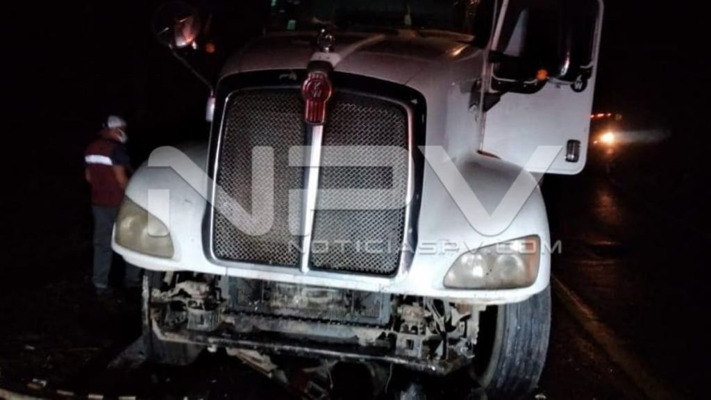 Aparatoso choque se registró la noche de este jueves sobre la carretera federal 200, adelante del crucero a Compostela, en donde se vieron involucrados un camión tipo trailer y un auto compacto, el cual terminó destrozado.