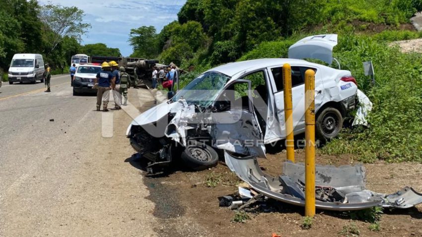 Fuerte accidente se registró por la carretera a Punta de Mita, frente al ingreso al hotel Palladium donde chocaron una góndola cargada de piedra y un taxi de Nuevo Vallarta, resultando varias personas lesionadas que fueron llevadas a recibir atención médica a un hospital en ambulancias privadas, desconociéndose hasta el momento su estado de salud, haciéndose cargo de tomar nota los oficiales de la Guardia Nacional (División Caminos.