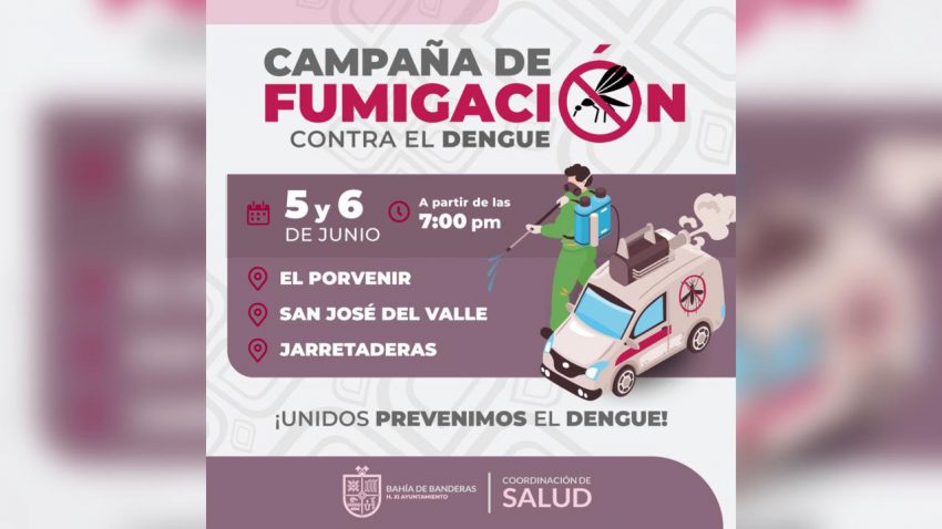 Serán los días 5 y 6 de junio cuando se estén fumigando las localidades de El Porvenir y La Jarretadera, esto a partir de la 7:00 de la tarde. Se solicita a la población de estos sitios estar pendientes del paso de los vehículos fumigadores, así como también abrir puertas y ventanas para que se logre una mayor penetraciónh del insecticida, mismo que es inocuo para los humanos y animales domésticos.