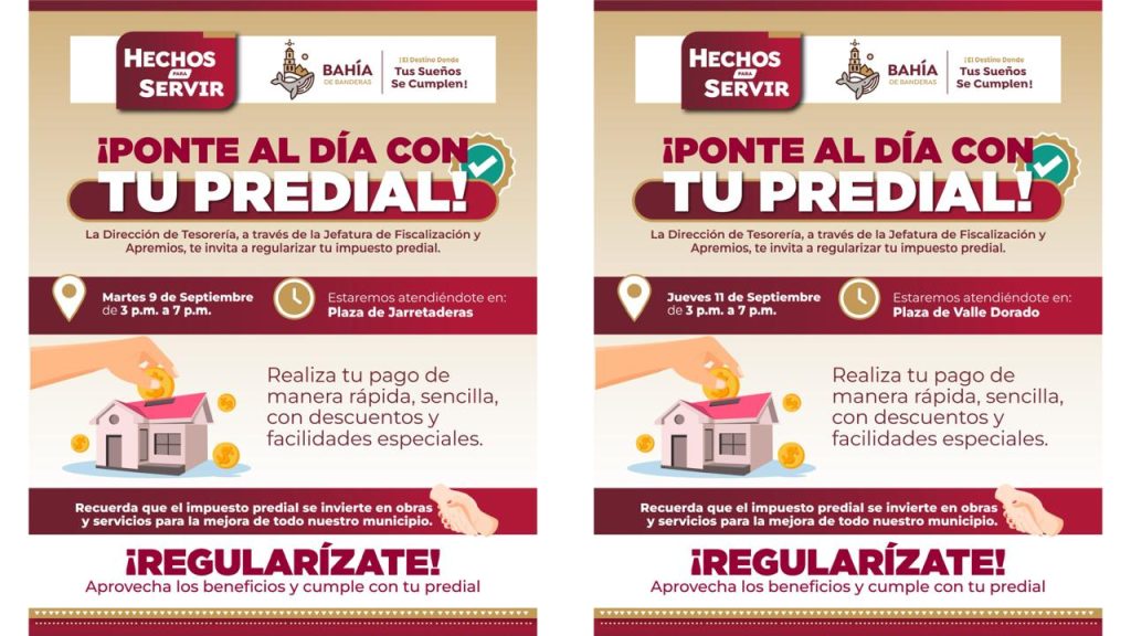 El Gobierno Municipal de Bahía de Banderas, a través de la Dirección de Tesorería y la Jefatura de Fiscalización y Apremios, invita a la ciudadanía a aprovechar las jornadas especiales de regularización del impuesto predial.