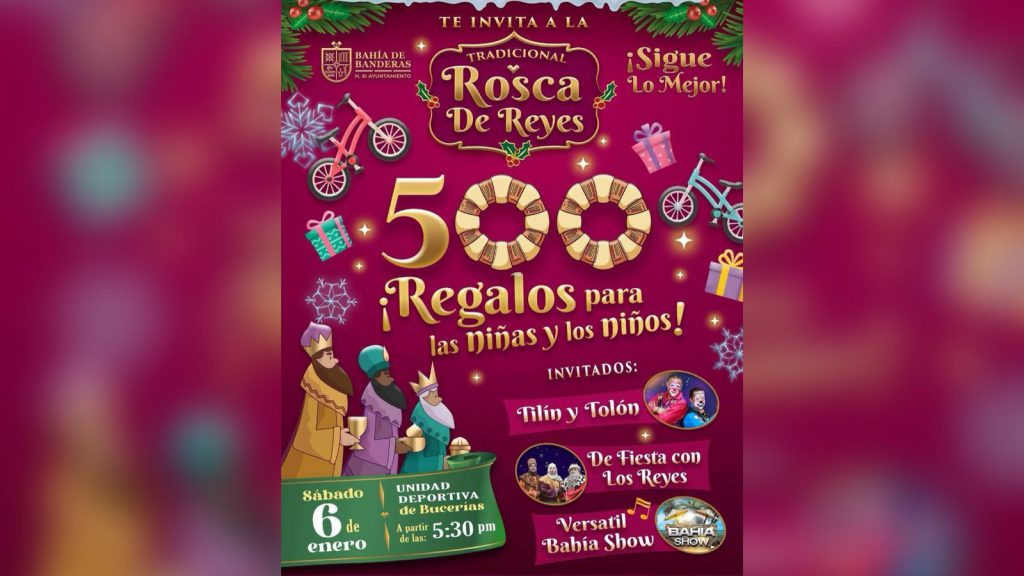 La cita es este sábado 6 de enero a partir de las 05:30 de la tarde en la Unidad Deportiva de Bucerías, en donde la entrada es gratuita y la presidente municipal, Mirtha Villalvazo, junto con su gabinete y el equipo del XI Ayuntamiento, estará compartiendo con las y los ciudadanos, niñas, niños y jóvenes, un pedazo de rosca, promoviendo así el mensaje de paz, amor y tradición que cada evento de este tipo aporta.