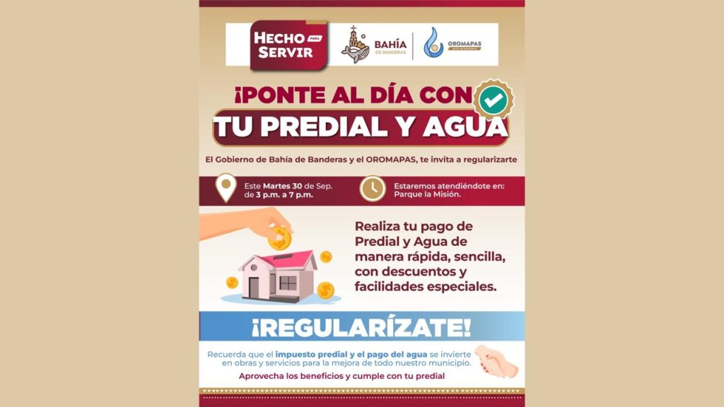 Con el objetivo de brindar facilidades a la ciudadanía y fortalecer la recaudación destinada a obras y servicios públicos, el presidente municipal de Bahía de Banderas, Héctor Santana, puso en marcha una campaña especial de regularización del pago de Predial y Agua, en coordinación con el OROMAPAS y la Jefatura de Fiscalización y Apremios.