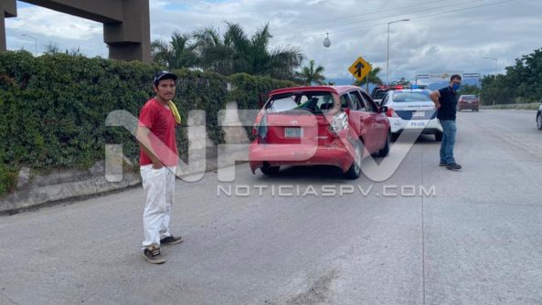 ?Góndola al servicio de Vidanta, chocó por alcance contra un auto Toyota, a la altura de la glorieta del Modulo de Seguridad de Jarretaderas, causándole cuantiosos daños materiales, donde afortunadamente no se reportaron víctimas que lamentar. (José Luis Preciado/NoticiasPV.Com).