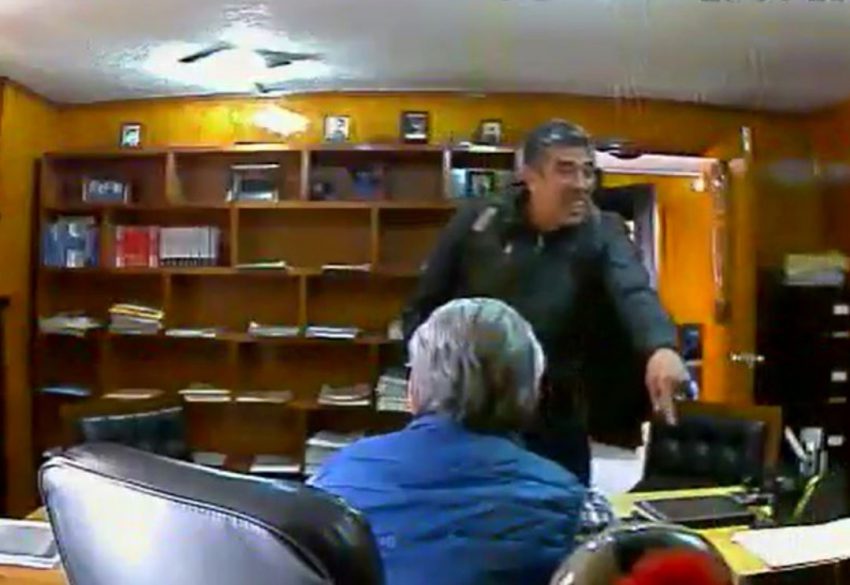 Enseguida, el pistolero amenaza con su arma a un joven que se encontraba en la recepción y lo obliga a entrar el despacho.