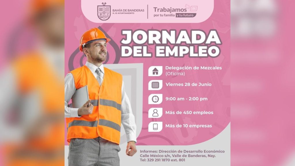 El evento dará inicio a las 9:00 horas y se extenderá hasta las 14:00 horas. La Jornada del Empleo se realizará en las oficinas de la Delegación de Mezcales. Para obtener más información, los interesados pueden dirigirse a la Dirección de Desarrollo Económico, ubicada en calle México s/n, en Valle de Banderas, o comunicarse al teléfono 329 291 1870, extensión 801.