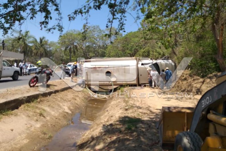 De los hechos dio a conocer que estos ocurrieron minutos después de las 12 del mediodía de este lunes, cuando en el módulo de emergencias del 911, recibieron el reporte donde les informaban que por la carretera del camino viejo, en el tramo de Bucerías, a Valle de Banderas, cerca de Arroyos Verdes, se había volcado una pipa del servicio particular, de color blanco, con capacidad aproximada de 8 mil litros, de la marca Dodge, con las placas PE-71-757 de Nayarit, propiedad de Distribuidora de la Costa del Nayar S.A. de C.V. en la que viajaban dos personas que al parecer estaban lesionadas de gravedad, por lo que pedían una ambulancia.