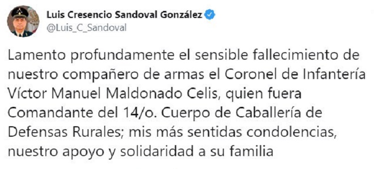 «Lamento profundamente el sensible fallecimiento de nuestro compañero de armas el Coronel de Infantería Víctor Manuel Maldonado Celis, quien fuera Comandante del 14/o. Cuerpo de Caballería de Defensas Rurales; mis más sentidas condolencias, nuestro apoyo y solidaridad a su familia».