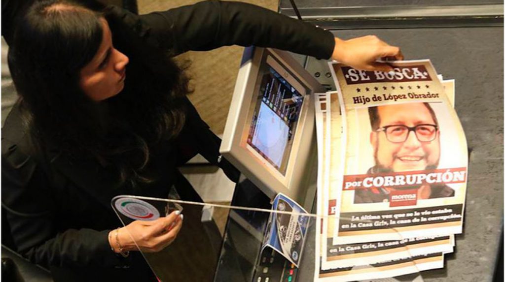 En el lado albiazul, los legisladores, liderados por Julen Rementería, colocaron letreros con la leyenda “se busca por corrupto” con la foto de José Ramón López Beltrán, hijo del presidente Andrés Manuel López Obrador, señalado por haber ocupado en Houston, Texas, una propiedad de un alto directivo de la empresa Baker Hughes, una de las compañías petroleras con la que el gobierno mexicano tiene contratos por millones de dólares.