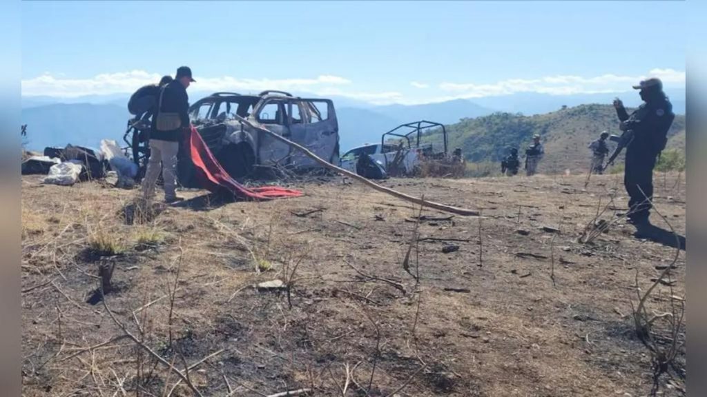 Heliodoro Castillo, Gro. Diez cadáveres calcinados en la batea de una camioneta fueron hallados por las autoridades de los tres niveles de gobierno y el Centro de Derechos de Las Víctimas de Violencia Minerva Bello en las inmediaciones de la comunidad de Buenavista de Los Hurtado (Cashacuautoitl), municipio de Heliodoro Castillo, sitio a donde se dirigieron ayer, tras la denuncia de los pobladores de un ataque con drones de La Familia Michoacana perpetrado el pasado jueves.
