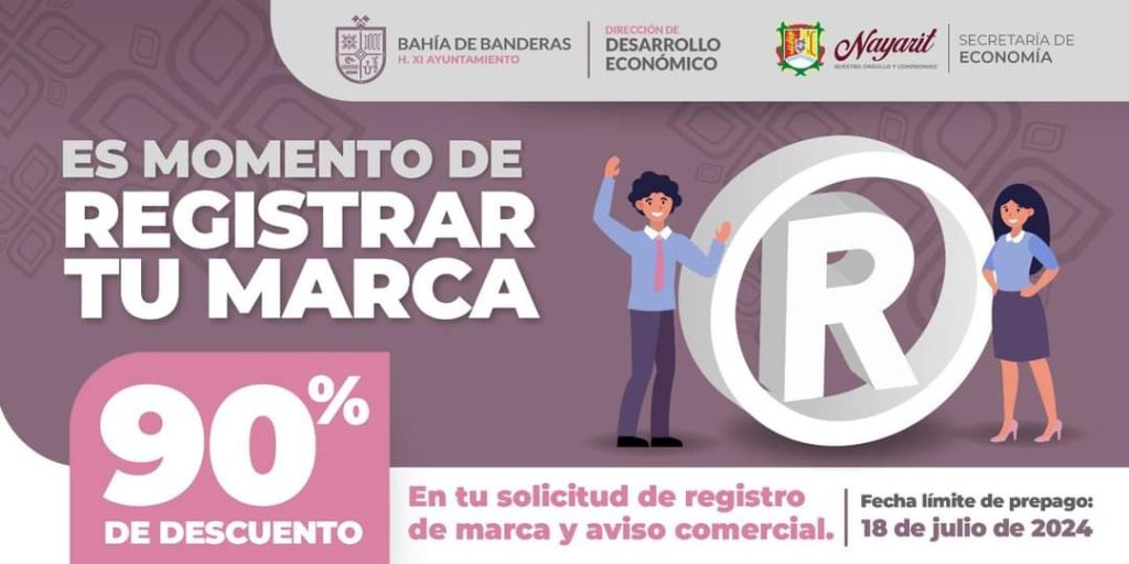 Bahía de Banderas Nay., 4 de junio de 2024.- El gobierno de Bahía de Banderas, a través de la Dirección de Desarrollo Económico invita a la población interesada a registrar su marca ante el Instituto Mexicano de la Propiedad Industrial (IMPI), con un 90% de descuento.