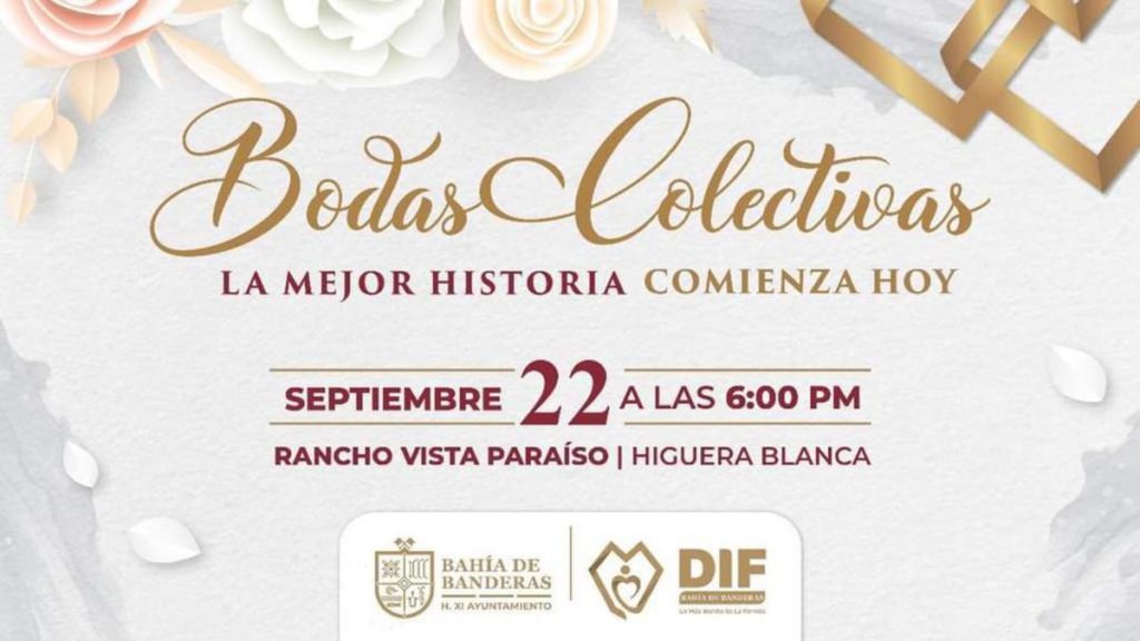 Bahía de Banderas Nay., 11 de septiembre de 2023.- Con el lema «La mejor historia comienza hoy», el XI Ayuntamiento de Bahía de Banderas, en conjunto con el Sistema DIF municipal y el Registro Civil, invita a contraer matrimonio en las bodas Cñcolectivas, a realizarse el próximo 22 de septiembre en el Rancho Vista Paraíso, en Higuera Blanca.