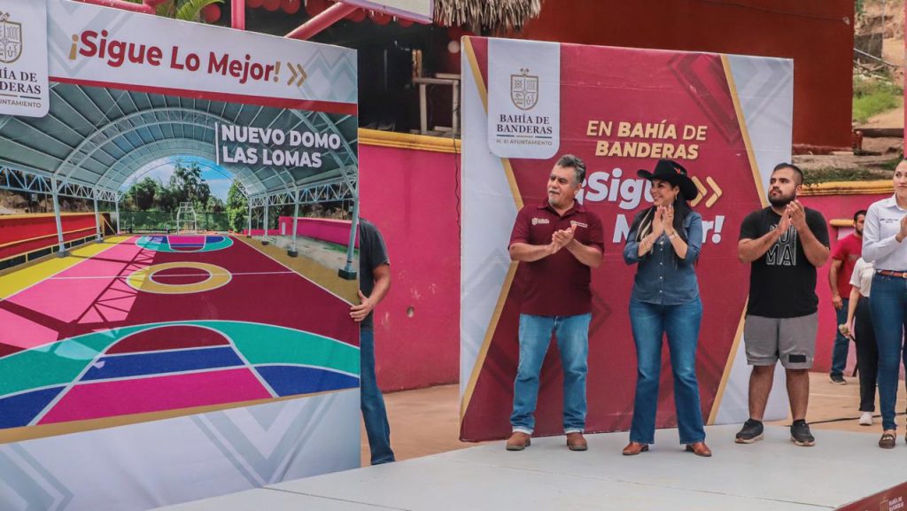 Bahía de Banderas, Nay., 6 de febrero de 2024.- Este martes la presidente municipal de Bahía de Banderas, Mirtha Villalvazo, dio el banderazo de arranque para la construcción de un domo, la renovación de la cancha pública y el empedrado de la lateral de acceso en la localidad de Las Lomas.