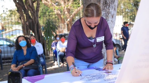 Puerto Vallarta, Jalisco.- Marina de los Santos y mujeres integrantes de su planilla firmaron este miércoles el “Pacto por la Sororidad” que, bajo convocatoria de la colectiva feminista local Perspectiva Violeta México, busca evitar la violencia política de género durante el presente proceso electoral.
