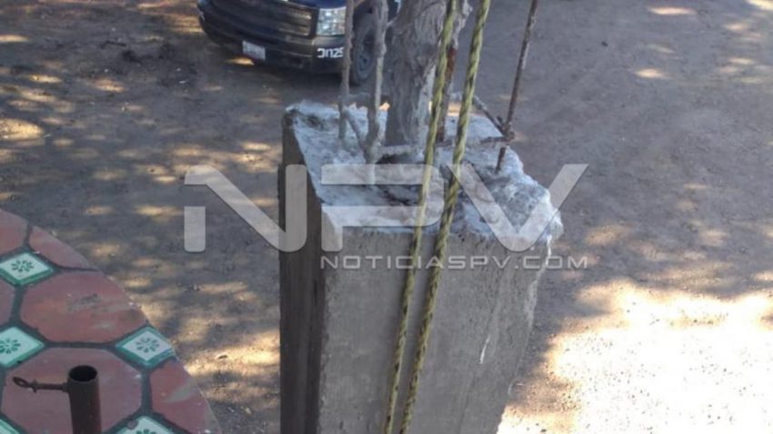 Informan que se trata de un masculino quien se aprecia con una soga de color amarillo que tiene atada al cuello y que cuelga de un poste de concreto quien viste playera descolorida tipo Polo de color gris y un short en color crema.