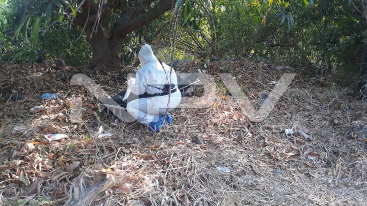Ahí abajo de unos árboles de mango estaba la persona fallecida que ya se encontraba en avanzado estado de descomposición, el cual vestía un pantalón de color blanco con playera tipo Polo de color café con franjas blancas y descalzo.