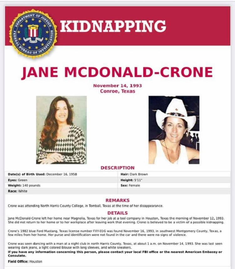 Según información de la ficha de búsqueda del FBI, Mcdonald-Crone desapareció el 14 de noviembre de 1993.