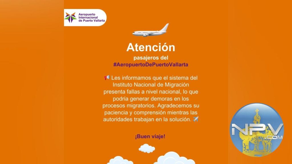 El Aeropuerto Internacional de Puerto Vallarta informó que el sistema del Instituto Nacional de Migración presenta fallas a nivel nacional, lo que podría generar demoras en los procesos migratorios. Se recomienda a los pasajeros tener paciencia mientras las autoridades trabajan en la solución.
