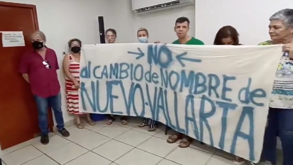 En el marco del inicio de la sesión de Ayuntamiento del Gobierno de Bahía de Banderas, llevado a cabo este martes 21 de junio 2022, vecinos de Nuevo Vallarta se manifestaron en la sala de cabildo, con una enorme manta donde piden a la autoridad no cambiar el nombre a «Nuevo-Nayarit».