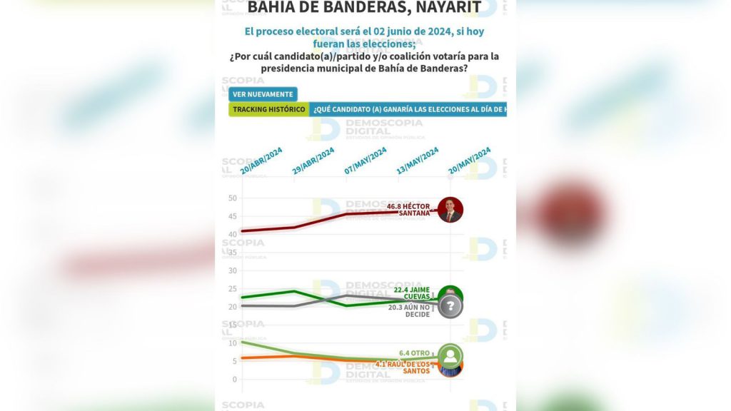 Esta tendencia, irreversible, vuelve a registrarse en el sondeo más reciente publicado por la casa encuestadora DEMOSCOPIA DIGITAL colocándolo con un 46.8 por ciento en las preferencias electorales de los bahiabanderenses.