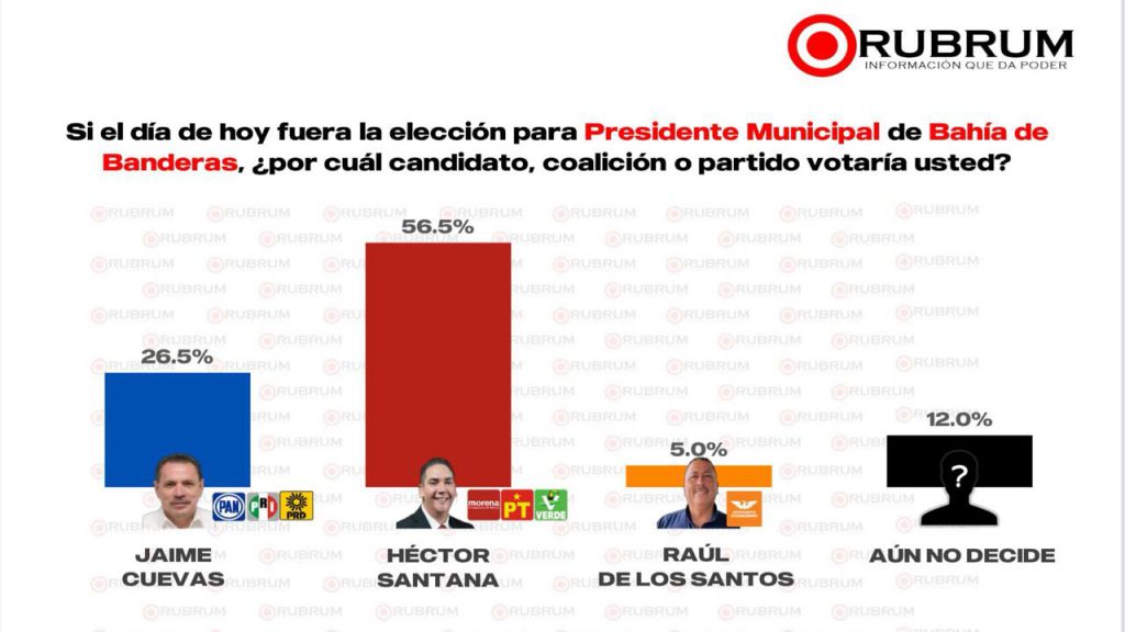 A ocho días de las elecciones, Héctor Santana se perfila como el favorito para la Presidencia Municipal de Bahía de Banderas, con un 56.5% de intención de voto según la encuestadora RUBRUM.