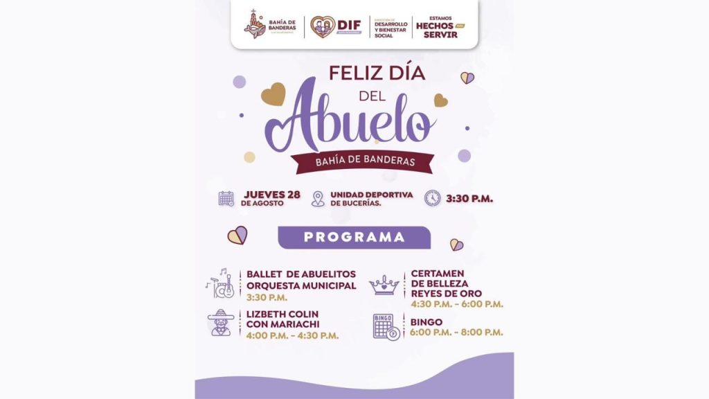 El Gobierno de Bahía de Banderas y el DIF municipal invitan este jueves 28 de agosto a un gran festejo por el Día del Abuelo en la Unidad Deportiva de Bucerías, con música, certamen de belleza, bingo y presentaciones artísticas.
