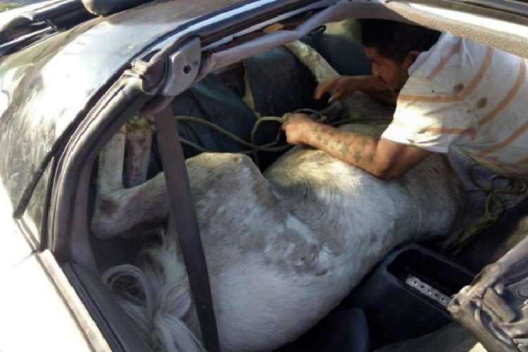 Para su sorpresa encontraron recostado un caballo color claro, ejemplar que estaba retorcido en el asiento posterior de la pequeña unidad, con las patas traseras y delanteras atadas. El equino tenía la cabeza acomodada en el reducido espacio que había entre el asiento del piloto y la puerta de ese lado.