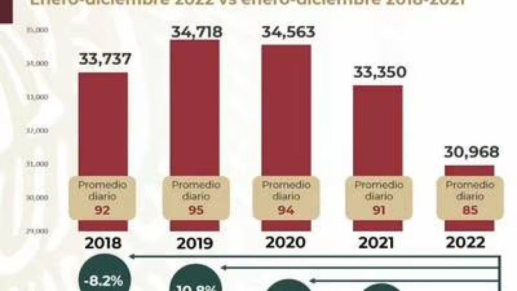 Con este dato, se pudo conocer que en 2022 se contabilizaron un total de 30 mil 968 homicidios dolosos en México, 7.1 por ciento menos que los registrados en 2021 y 10.4 por ciento menos que los computados en 2020.