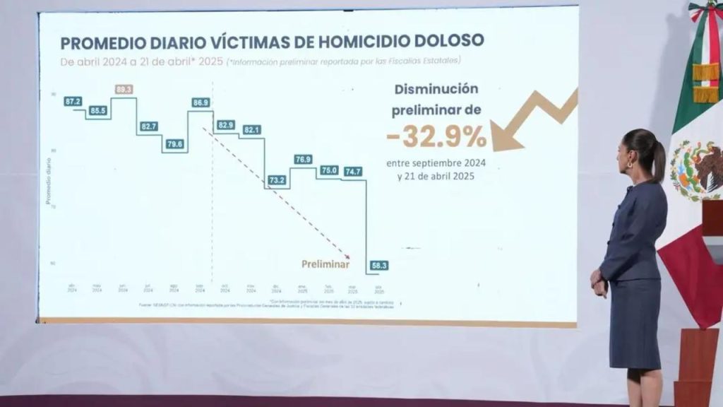 Ciudad de México. De acuerdo a los datos oficiales del Secretariado Ejecutivo del Consejo Nacional de Seguridad Pública, los homicidios dolosos en México se han reducido en 28.1 por ciento entre enero de 2024 y abril de 2025. La titular del secretariado, Marcela Figueroa, explicó que en estos últimos días incluso los asesinatos en el país se redujeron hasta 58.3 personas al día.