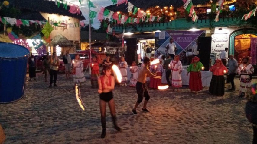 La celebración dio inicio con un colorido desfile con elementos que enriquecen la vida cultural de Sayulita, como zanqueros, artistas de fuego, batucada y percusiones, que lograron una mezcla cultural de lo que existe en la comunidad de Sayulita, terminando con un baile en la plaza pública, donde turistas y locales disfrutaron en un ambiente familiar.