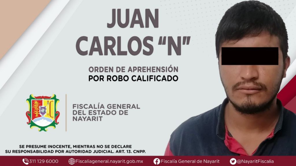 Es por ello que personal de la Agencia de Investigación Criminal de Nayarit dio cumplimiento a una orden de aprehensión contra Juan Carlos “N”, originario de Puerto Vallarta, Jalisco y vecino de la localidad San Vicente, municipio de Bahía de Banderas, por su presuntiva responsabilidad penal en hechos que la ley señala como delito de robo calificado.