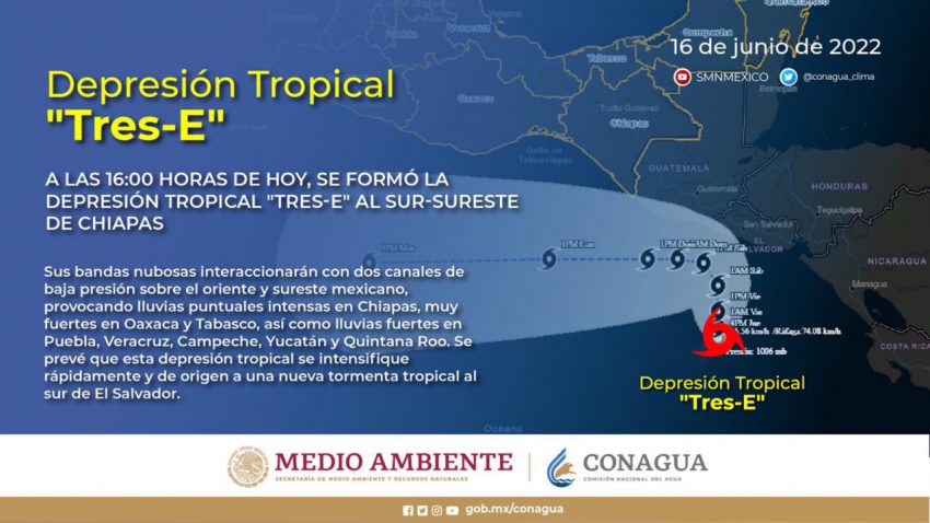 En tanto, la Depresión Tropical Tres-E se localiza aproximadamente a 305 km al sur- sureste de Puerto San José, Guatemala, y a 440 km al sureste de la desembocadura del río Suchiate, frontera entre México y Guatemala. Tiene vientos máximos sostenidos de 55 kilómetros por hora (km/h), rachas de 75 km/h y mantiene desplazamiento hacia el norte a 4 km/h.