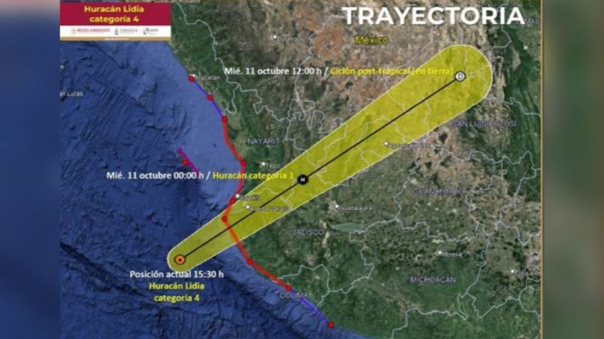 - Ubicación y Trayectoria: Lidia se encuentra a 130 km al suroeste de Cabo Corrientes, Jalisco, y a 175 km al suroeste de Puerto Vallarta, Jalisco. Su movimiento actual es hacia el este-noreste a 26 km/h.