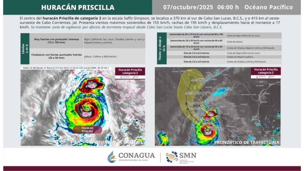 El Servicio Meteorológico Nacional (SMN) informó en su actualización de las 06:00 horas de este martes 7 de octubre que el huracán “Priscilla” se intensificó a categoría 2 en la escala Saffir-Simpson.