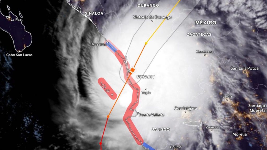 Durante la mañana provocará viento con rachas de 120 a 150 km/h y oleaje de 5 a 7 metros (m) de altura con marea de tormenta en costas de Nayarit y la costa norte de Jalisco; rachas de 100 a 120 km/h y oleaje de 4 a 6 m con marea de tormenta en la costa centro y sur de Jalisco, y rachas de 60 a 80 km/h con olas de 2 a 4 m en costas de Colima y el sur de Sinaloa.