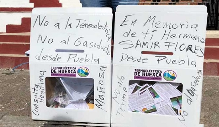 “En memoria de ti, hermano Samir Flores, desde Puebla”, “No al gasoducto, No a la termoeléctrica”, “Consulta Ilegítima, mañosa”, escribieron los pobladores sobre las dos urnas que pretendían colocar en Zacatepec  los enviados del gobierno.