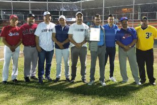También estuvieron el presidente de la Liga de Softbol, Martín Rodríguez, el vicepresidente de la Liga de Béisbol, Osiris García; el subdirector de Comude, William Arredondo, y el homenajeado Marco Antonio González Villaseñor.