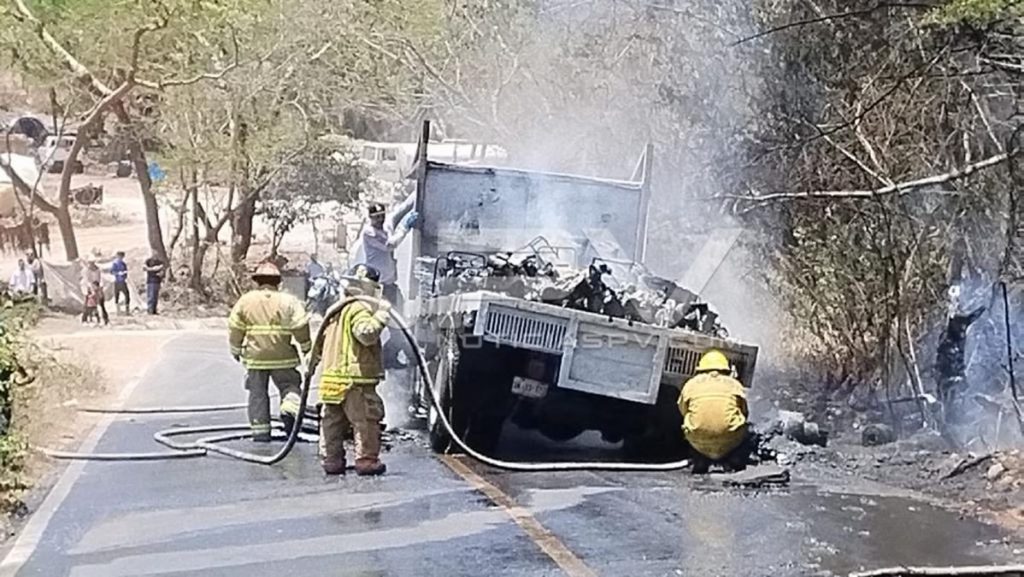 Autoridades respondieron a un incendio en un tráiler proveniente de Culiacán, Sinaloa, que transportaba productos agrícolas en la carretera libre hacia Aticama – San Blas.