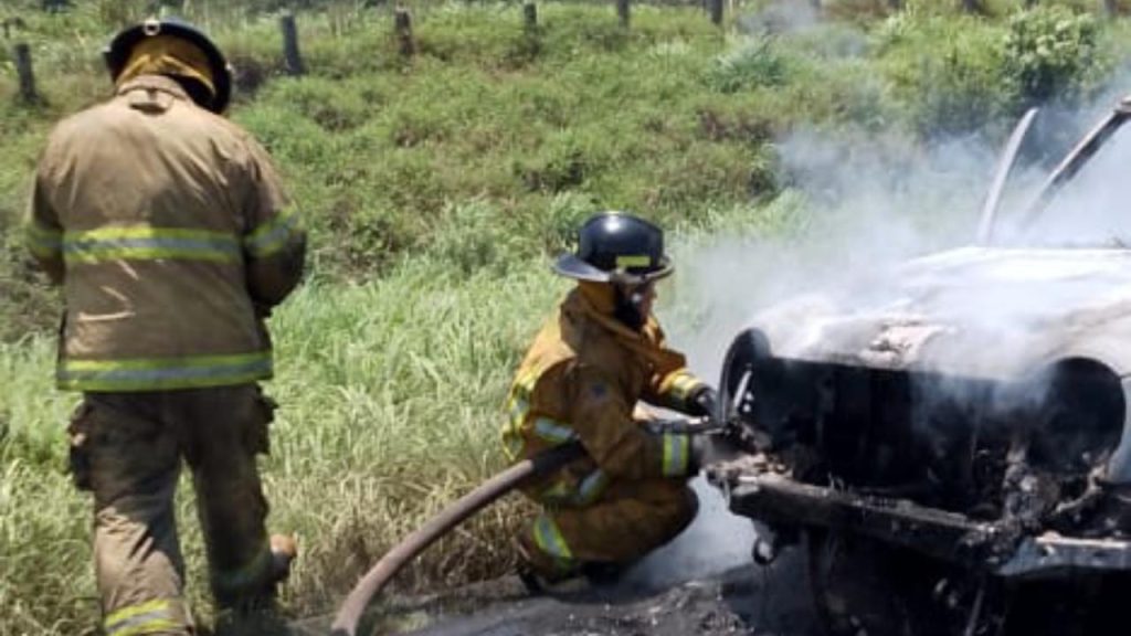 Bomberos de Nayarit respondieron a un llamado de emergencia para extinguir el incendio de un vehículo en la carretera Federal 15D Tepic – Guadalajara, a la altura del kilómetro 127+200, entre las localidades de Tinajas de Santa Isabel y Chapalilla, en el municipio de Santa María del Oro.