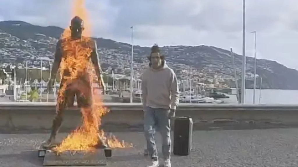 La emblemática estatua de Cristiano Ronaldo en Funchal, su ciudad natal, volvió a ser blanco de un acto de vandalismo extremo. En esta ocasión, un joven influencer identificado en redes sociales como ‘zaino.tcc.filipe’, fue interceptado por las autoridades tras grabarse a sí mismo rociando gasolina e incendiando la figura de bronce ubicada frente al museo del futbolista.