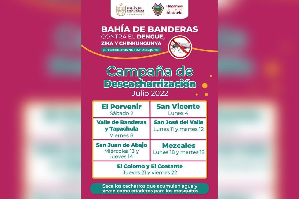 Bahía de Banderas a 30 de junio de 2022.- Con base al muestreo que se realiza por los Servicios de Salud del Gobierno de Bahía de Banderas, se ha decidido hacer una jornada más de descacharrización, a partir sábado 2 de julio comenzando en El Porvenir, posteriormente será en San Vicente, pues son los poblados del centro del Municipio donde más se ha concentrado el nacimiento del mosquito Aedes aegypti, portador de dengue, zica y chikungunya.