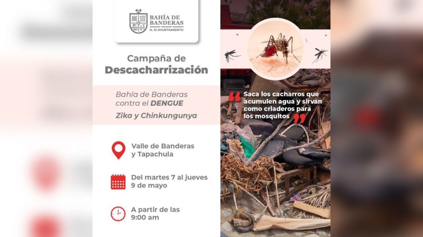 Bahía de Banderas Nay., 3 de mayo de 2024.- La Coordinación es de Salud invita la población de Valle de Banderas, así como también a la comunidad de Tapachula, a participar en la próxima campaña de descacharrización.