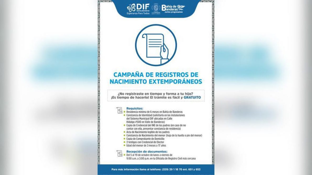 A partir del lunes 5 y hasta el viernes 19 de octubre del presente año, el Gobierno Municipal de Bahía de Banderas que encabeza el doctor Jaime Cuevas Tello, en coordinación con el Sistema DIF que dirige la LTS Ana Esperanza Berumen, llevará a cabo a la Campaña de Registros de Nacimiento Extemporáneos.